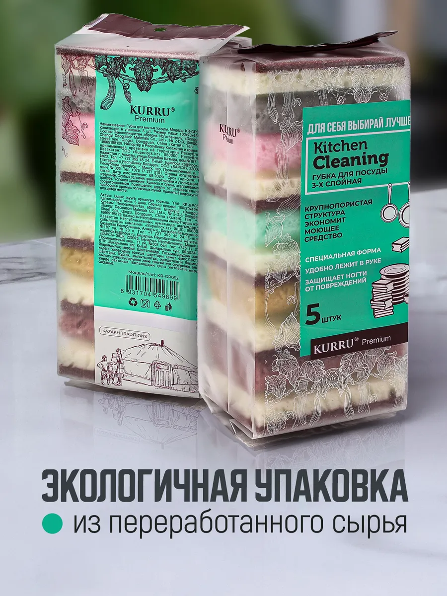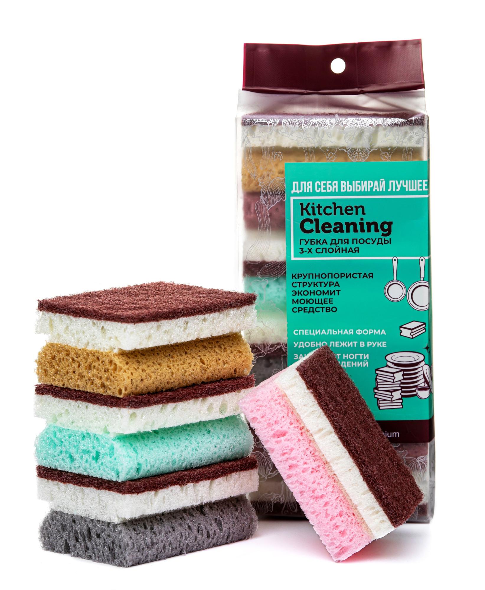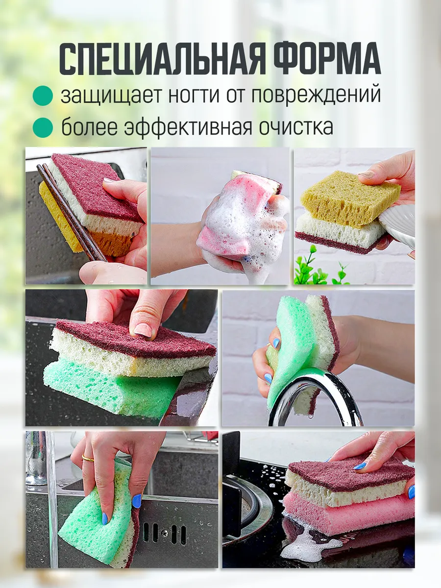 Набор из 5 больших трехслойных губок для мытья посуды со специальным углублением для удобного захвата и защиты ногтей от повреждений и крупнопористой структурой - идеальное решение для ежедневной уборки и чистки.