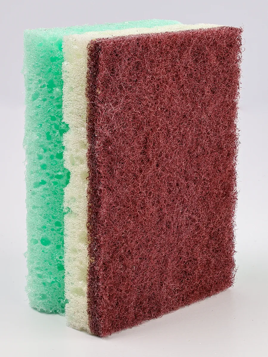 Губки двусторонние, имеют прямоугольную форму с особым пазом на боковой стороне, удобную для захвата. Надежная склейка предотвращает расслаивание и продлевает срок службы. С одной стороны губка оснащена абразивным покрытием из полиэстера, с синтетическими абразивными частицами. Жесткий слой эффективно удаляет стойкие загрязнения, въевшуюся грязь, жир и пригоревшие остатки пищи, не повреждая поверхность посуды и не оставляя царапин. Вторая сторона имеет особую текстуру с крупными порами, которая помогает экономить чистящее средство за счет увеличенного пенообразования. Специальный тип пенополиуретана не проскальзывает, не деформируется и не становится рыхлым.